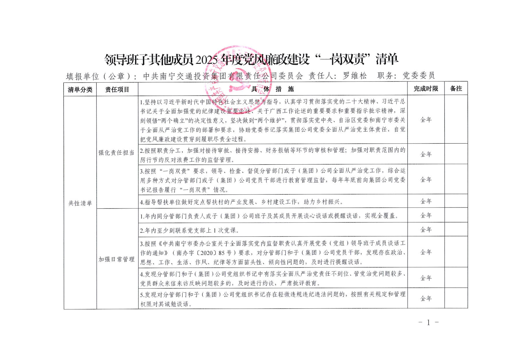 南寧交投集團領(lǐng)導(dǎo)班子其他成員2025年度黨風(fēng)廉政建設(shè)“一崗雙責(zé)”清單(四)