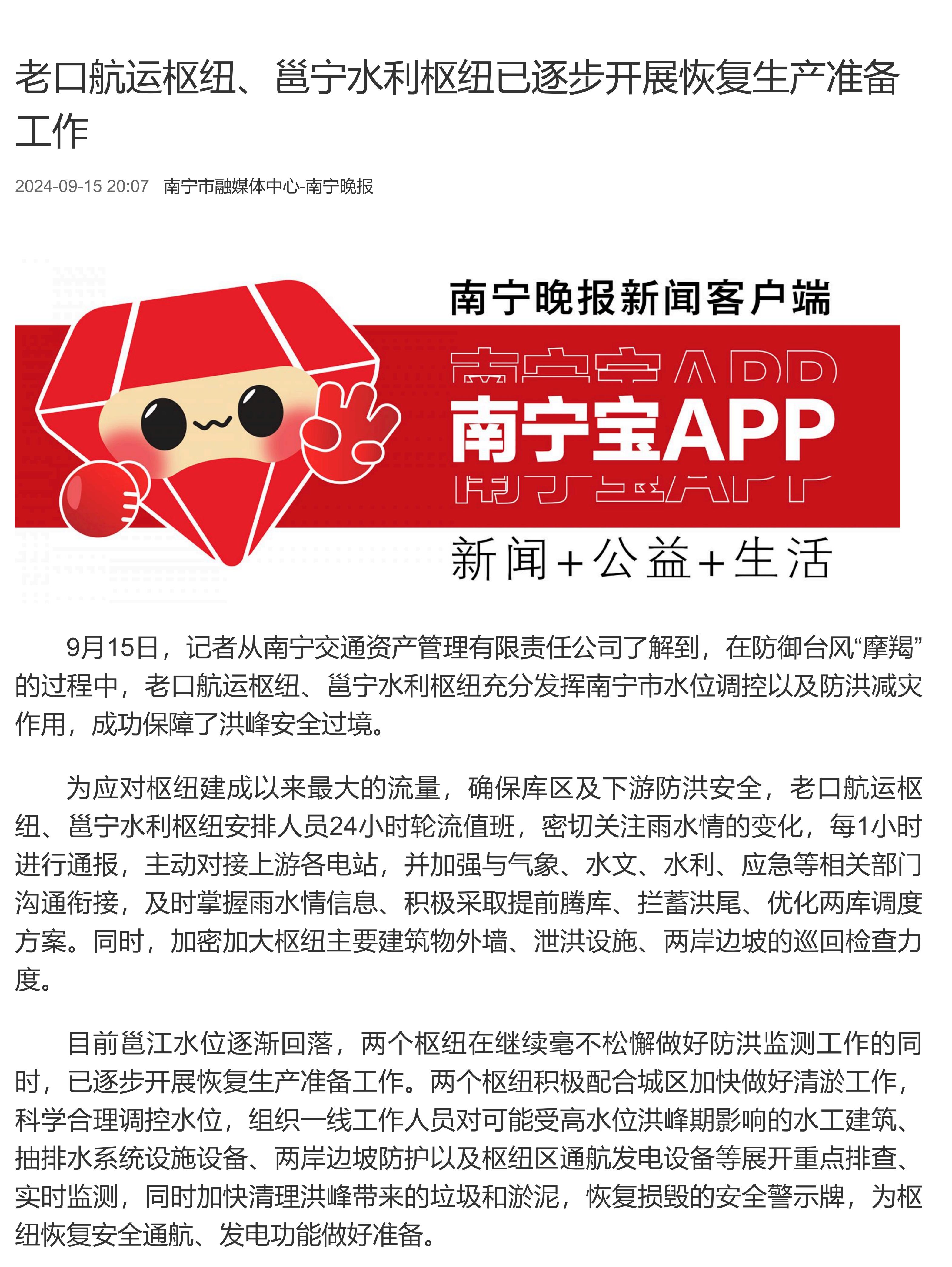老口航運(yùn)樞紐、邕寧水利樞紐已逐步開展恢復(fù)生產(chǎn)準(zhǔn)備工作